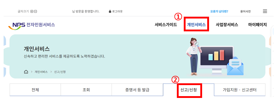 ② 로그인 후, 개인서비스에서 신고/신청을 선택합니다.