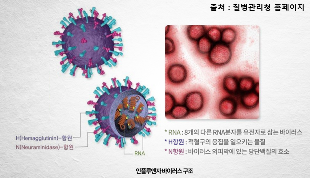 독감은 인플루엔자 바이러스의 핵산 구성에 따라 구분이 됩니다. 주로 A, B형이 사람에게 독감을 유발시키며 C형의 경우 드물게 감염을 일으키고, 증상도 미비한 편이라고 합니다. A형은 바이러스 표면에 있는 H항원과 N항원의 종류에 따라 여러 가지 종류가 존재하며 B형은 증상이 약하고 한 가지만 존재합니다. 보통 사람들에게 독감을 일으키는 항원은 H1, H2, H3와 N1, N2이며, 바이러스 내에서 유전자 돌연변이가 일어나거나 사람에게 영향을 줄 수 있는 항원과 유전자 교환을 통해 사람에게도 영향을 줄 수 있는 형태로 변질될 수 있다고 합니다.(본래 조류의 H항원과 N항원은 사람에게 병을 발생시키지 않음)