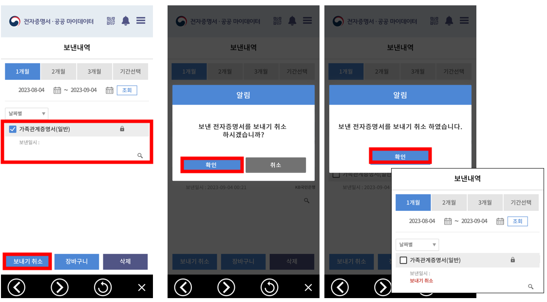 서류를 취소하는 방법은 더욱이 간단합니다. 정부24 어플에서 전자증명서에서 보낸 내역(송신함)으로 이동합니다. 서류를 선택하고 보내기 취소를 누르면 확인창 및 보내기 취소 완료창을 확인할 수 있습니다.