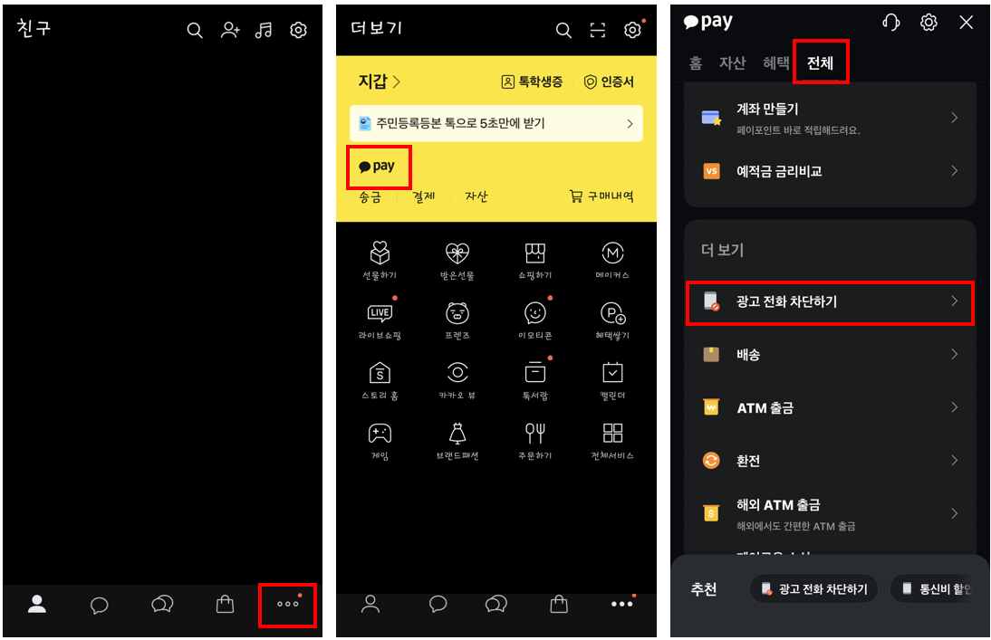 ③ 카카오pay 페이지에서 전체탭을 선택하고 더보기에서 광고 전화 차단하기를 선택합니다.