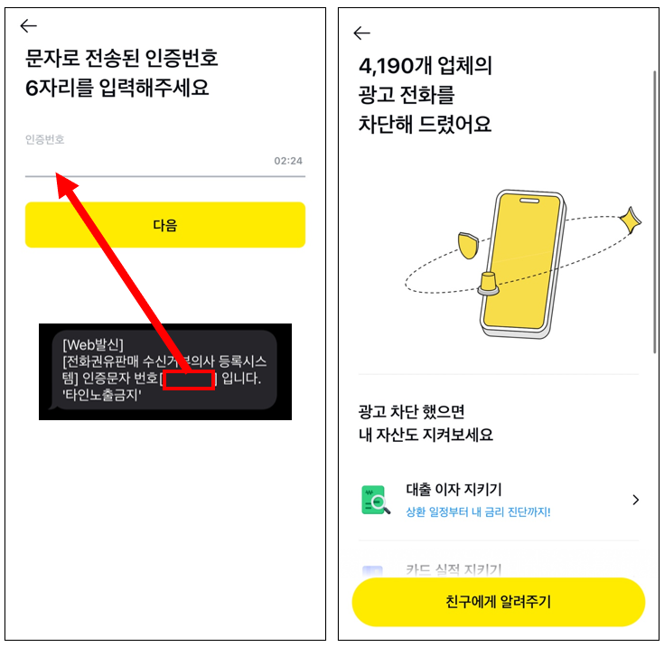 ⑥ 문자로 받은 인증번호를 입력 후, 다음 버튼을 선택하면